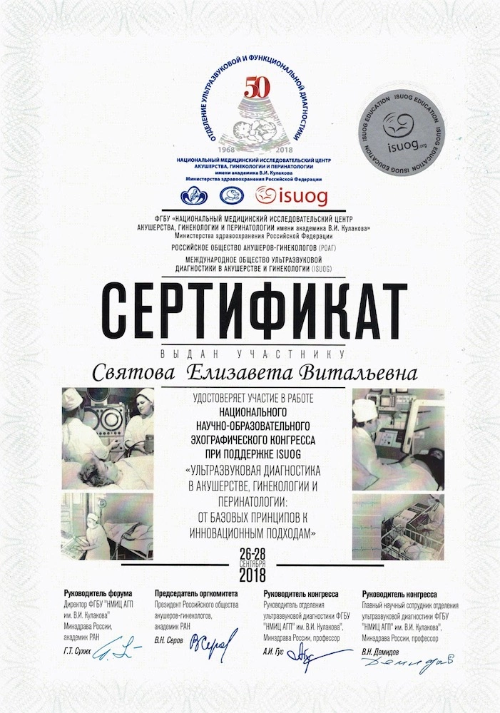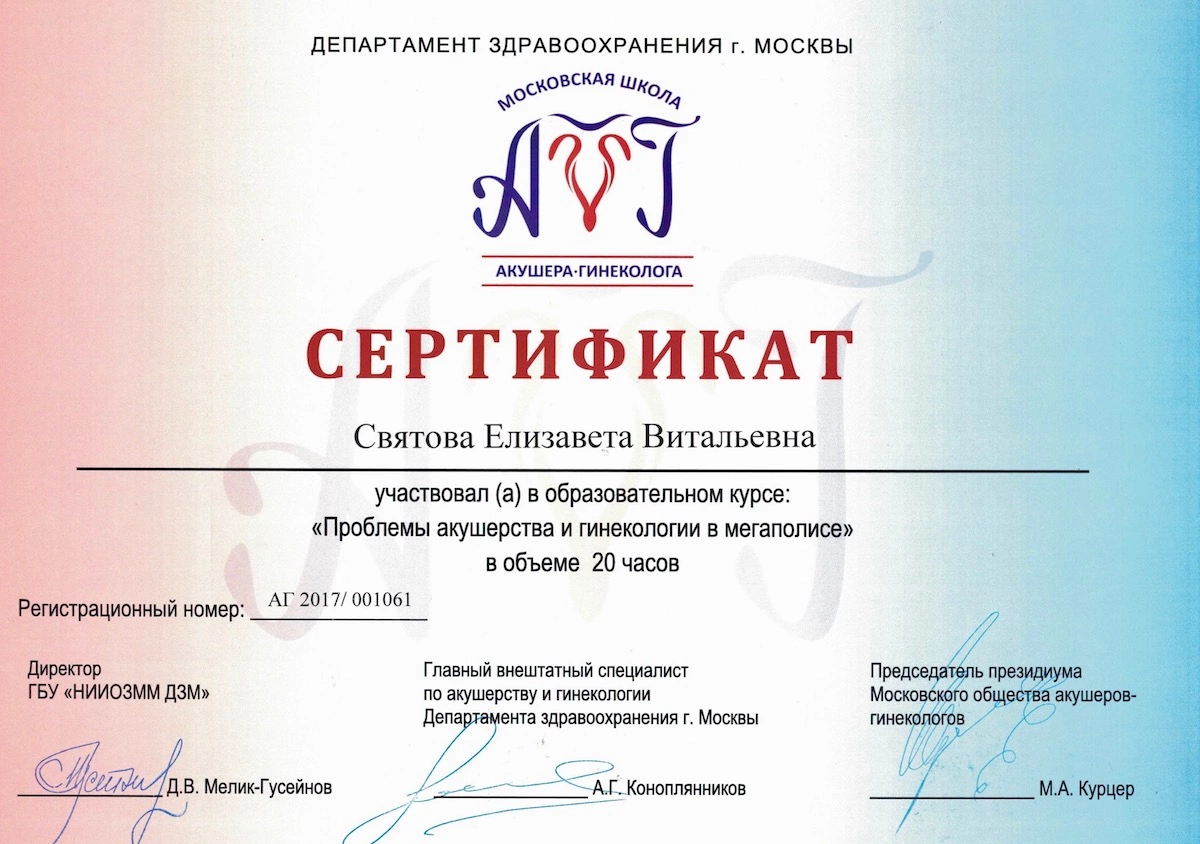 Являясь опытным специалистом в сфере воспалительных гинекологических заболеваний и акушерства, Елизавета Витальевна не забывает и о повышении профессионального уровня, каждый год посещая разнообразные курсы и семинары.